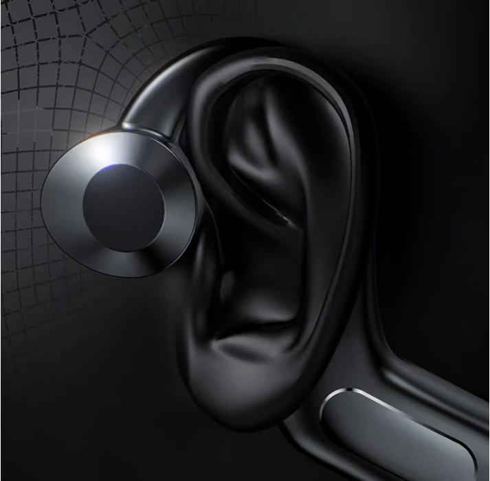 ينتقل الصوت عبر عظام الوجه (الفك والخدين) مباشرة للأذن الداخلية، بدون ما تدخل السماعة داخل الأذن 👂✨