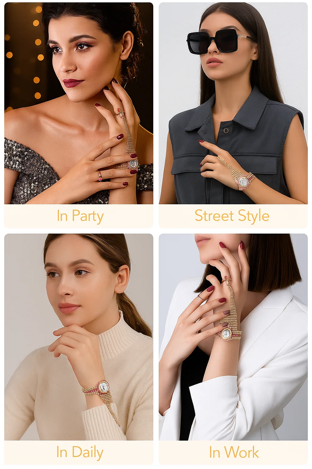 تصميم يجمع بين الأناقة العصرية والأنوثة الراقية، ليمنحك ساعة وسوار وخاتم في تناغم مثالي يعكس ذوقك الرفيع